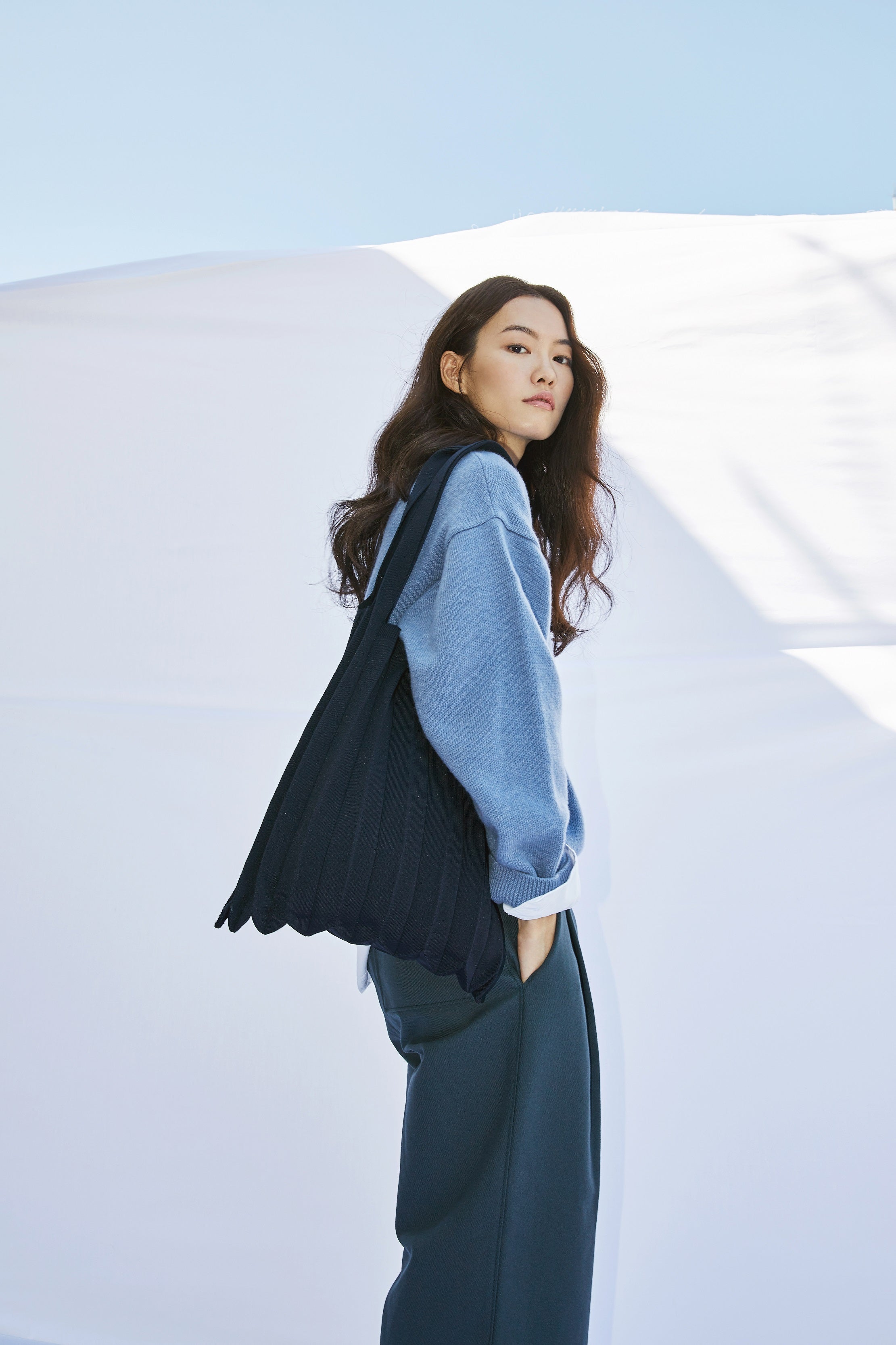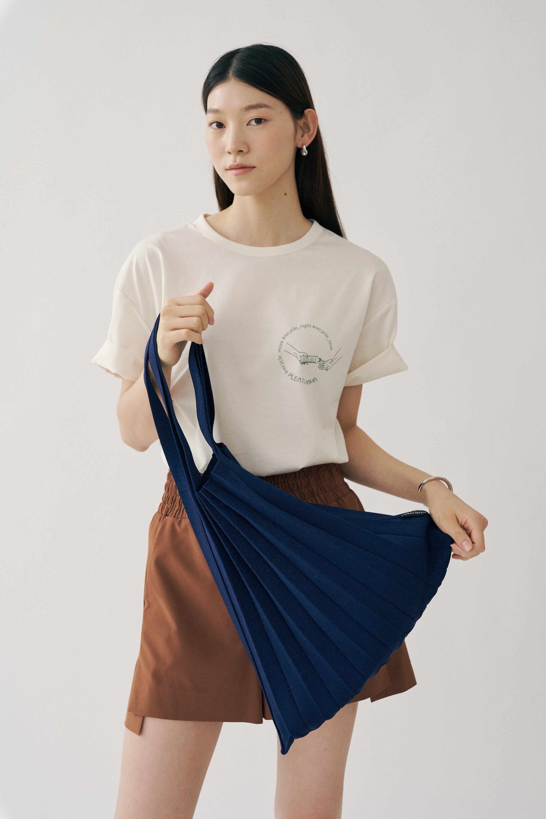 PLEATSMAMA, a leading sustainable fashion brand from South Korea, is saving petroleum resources, thereby dramatically reducing carbon dioxide emissions and landfilling, by using 100% recycled polyester from PET bottle waste from Jeju Island. The knit bags are made using the linking sewing process - a high-quality sweater sewing technique to minimize fabric waste. The pleats are not created artificially with high heat or chemicals but are natural wrinkles created from structural weaving. They have excellent resilience even after long-time use and washing.