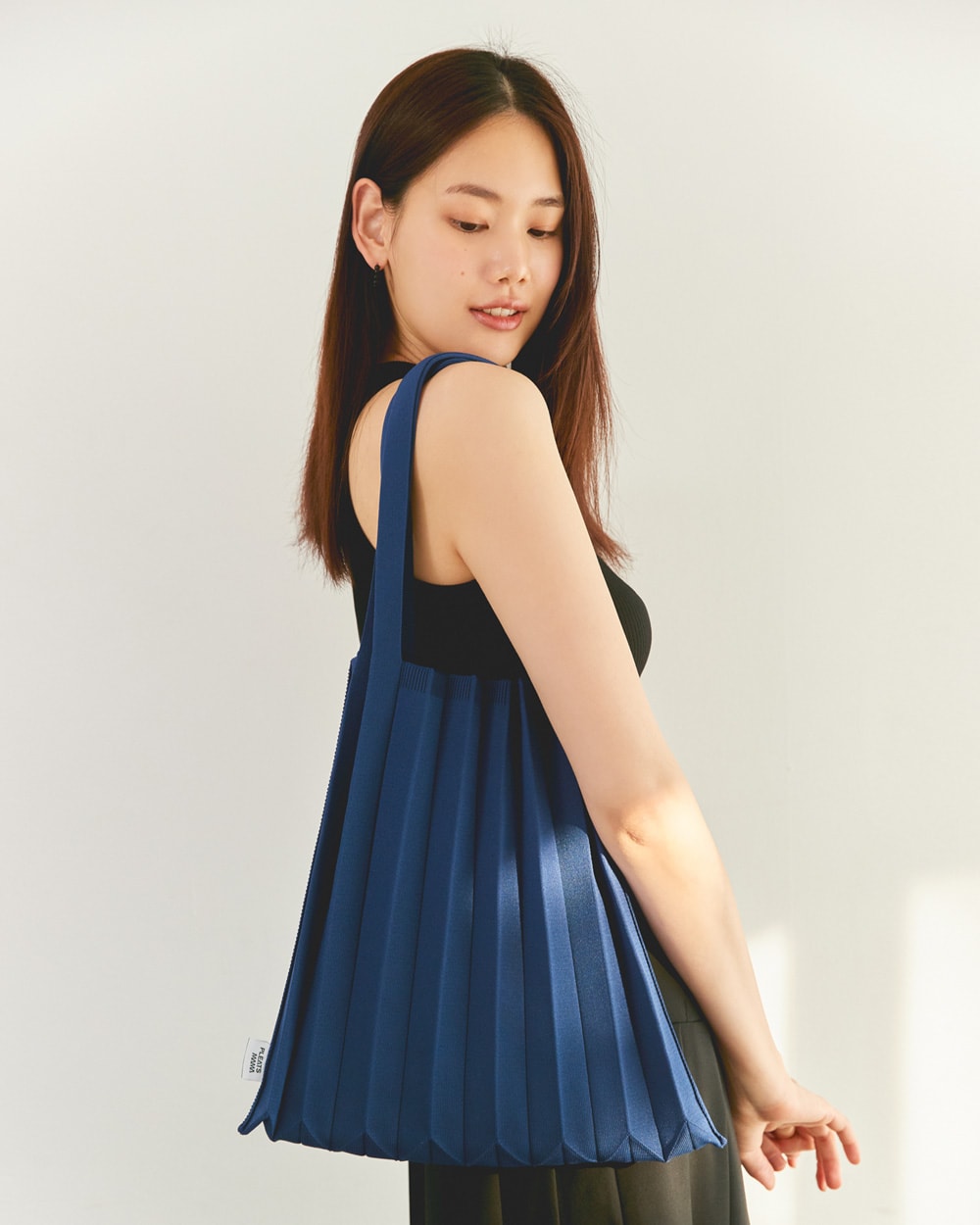 PLEATSMAMA, a leading sustainable fashion brand from South Korea, is saving petroleum resources, thereby dramatically reducing carbon dioxide emissions and landfilling, by using 100% recycled polyester from PET bottle waste from Jeju Island. The knit bags are made using the linking sewing process - a high-quality sweater sewing technique to minimize fabric waste. The pleats are not created artificially with high heat or chemicals but are natural wrinkles created from structural weaving. They have excellent resilience even after long-time use and washing.